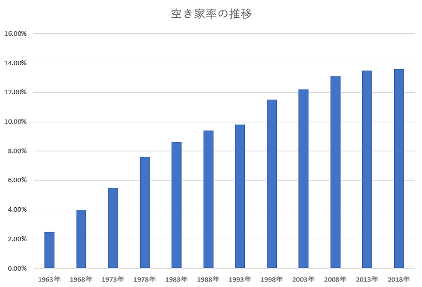 上記空き家率は、統計を取り始めた1963年以降一貫して上昇し続けており、1963年に2.5%だった空き家率は2003年に9.8%、2018年に13.6%と推移しました。
