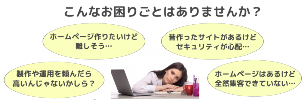 | お客様のご要望 | ・会社の信頼性と売上向上のため、会社概要とサービスを掲載したい。 ・お問合せ窓口を作りたい。 |