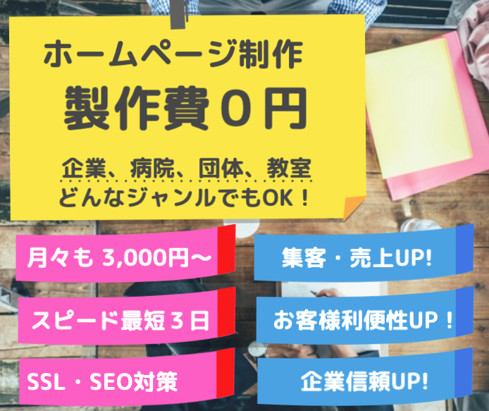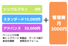 製作費(無料〜) + 運営費 3,000円/月 の構成となります。