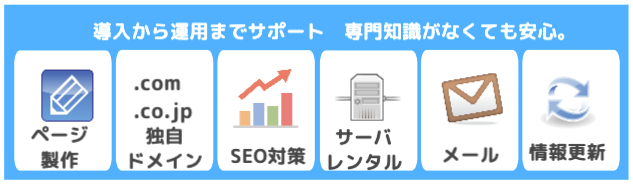 | プラン | (1)製作時 カスタムコース :49,800円 ドメイン取得 : 2,000円 (2)運営費 サイト管理 :2,200/ 月 ドメイン維持費 :数百円〜数千円/年程度 内容変更 :①簡易変更500 ②新規ページ追加 3,000/1P |
